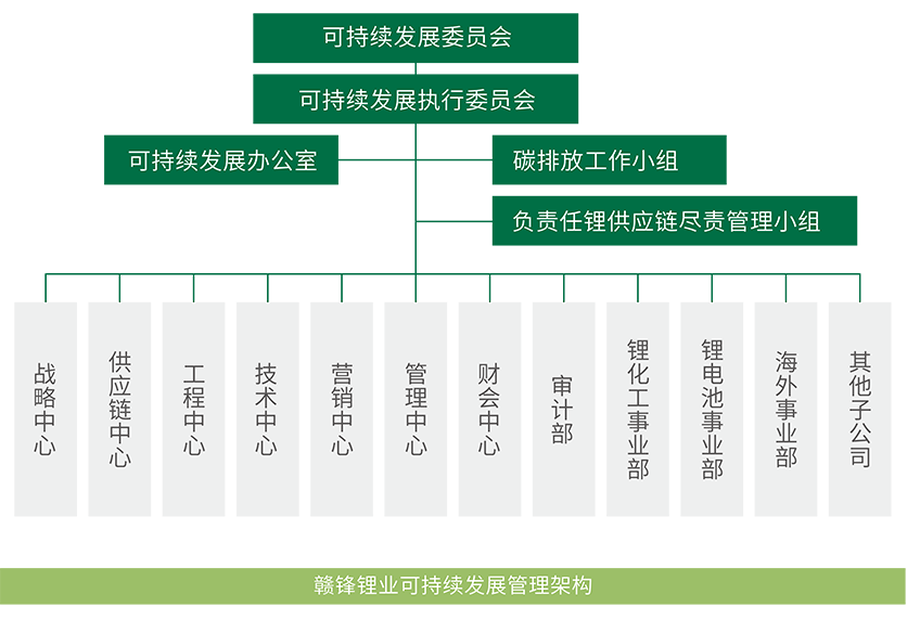 赣锋锂业董事会作为公司可持续发展管理和 ESG 相关议题的最高负责及决策机构,对公司可持续发展管理方针与ESG策略履行议事、决策、管理和监督责任。公司在董事会层面下设可持续发展委员会,由公司总裁负责牵头公司的可持续发展目标设定、发展规划和监督工作的落实,督导公司各业务板块可持续发展体系的正常运行。