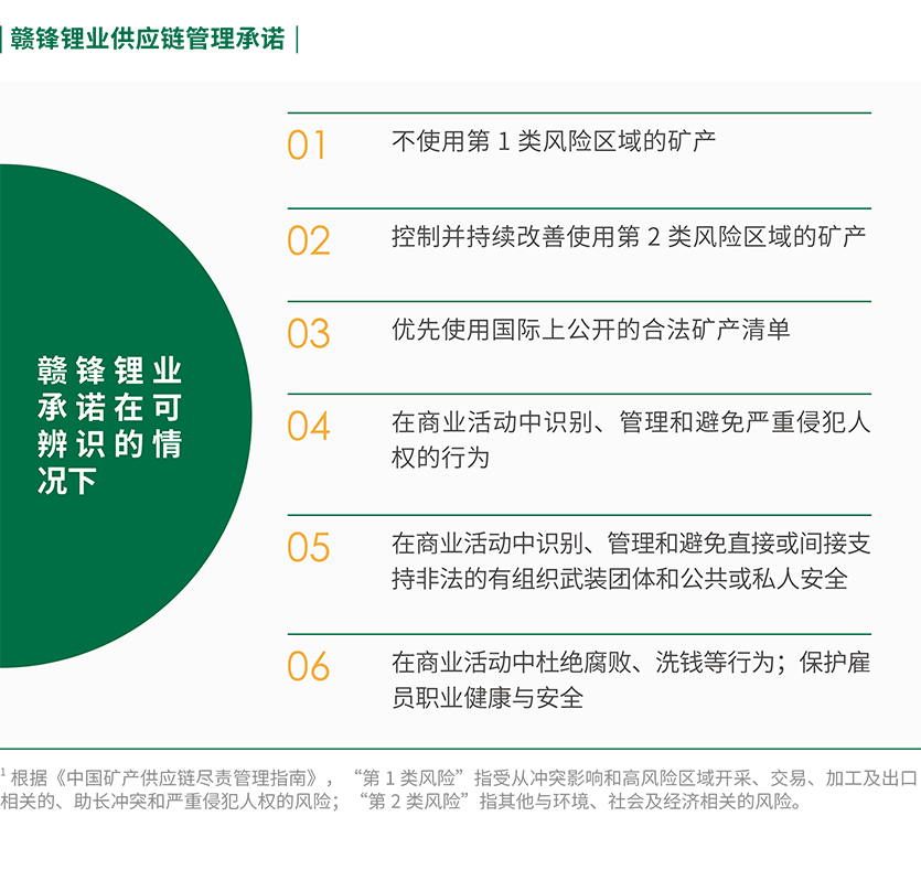 对于生产过程中可能涉及的锂金属矿产资源使用情况,公司坚持道德采购,承诺不使用来自冲突地区的矿产资源,也明确要求供应商不得使用来自冲突地区及违反公司政策的矿产资源。为处理负责任矿产供应链的风险与隐患,公司常态化冲突矿产专项管理,并根据海内外业务动态不断进行完善。公司经营人员在澳大利亚、阿根廷、墨西哥、爱尔兰等地投资参股锂矿权项目并担任董事,与其签订包销协议,通过股权与包销协议的方式,确保矿原材料的来源、运输路径明确,达到风险可控、可追溯的目的。