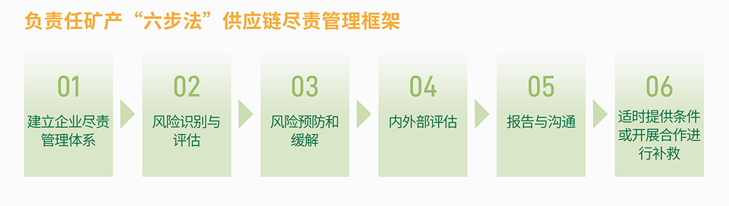 公司遵循《经济合作与发展组织受冲突影响和高风险区域矿石负责任的供应链尽职调查指南(第三版)》《中国对外矿业投资行业社会责任指引》《中国矿产供应链尽责管理指南(第二版))等文件,于内部制定了《负责任矿产资源供应链管理政策》等文件,并基于政策要求供应商签署《供应商行为准则》《不使用冲突矿产承诺书》邀请供应商填写矿物报告、KYS 等调查表,引导和规范上游锂矿供应商行为,完善锂供应链尽责管理,鼓励其承担更多的环境和社会责任。