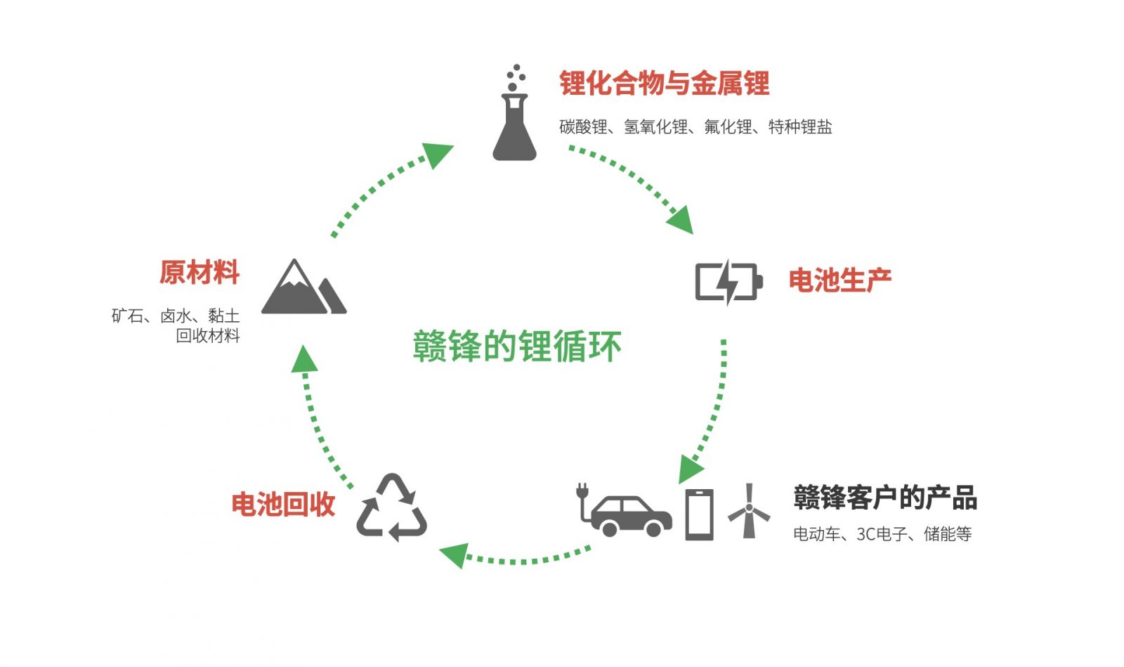 近年来,赣锋业务从最初的锂化合物制造,已延伸至上游锂资源开发、中游锂盐深加工及金属锂冶炼、下游锂电池制造及废旧电池综合回收利用等价值链的各重要环节;并与世界一流的电动车、清洁能源、消费电子设备、制造、医药企业精诚合作,共同推动锂资源在各领域的应用,促成全球范围的锂生态布局。